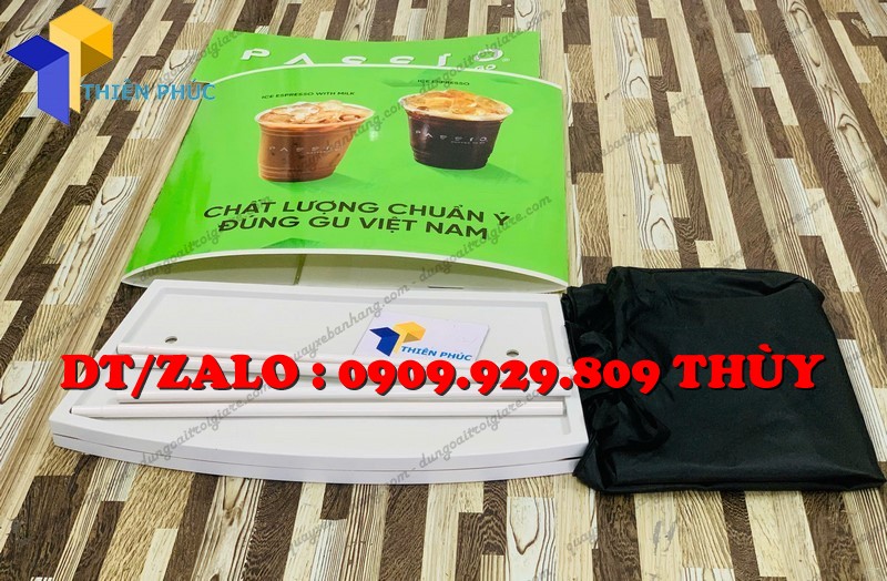 + Phần tấm logo phía trên là 0.3×0.8m chất liệu decal ngoài trời, cắt sát để cán bồi lên bề mặt bàn và tấm logo