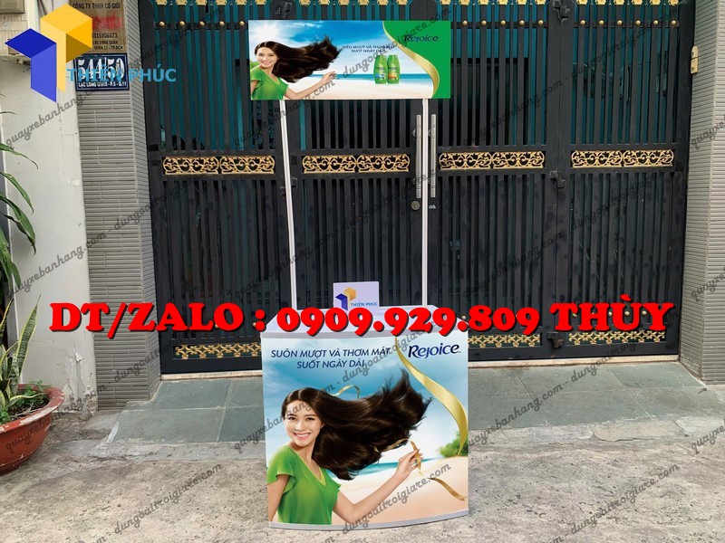 Phần bảng hiệu phía trên giúp tăng chiều cao tổng thể lên gần 2 mét, dễ nhìn thấy trong không gian đông người, giúp khách hàng chú ý ngay lập tức.