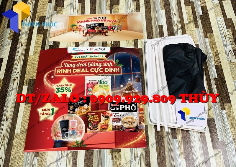 + Phần tấm logo phía trên là 0.3×0.8m chất liệu decal ngoài trời, cắt sát để cán bồi lên bề mặt bàn và tấm logo