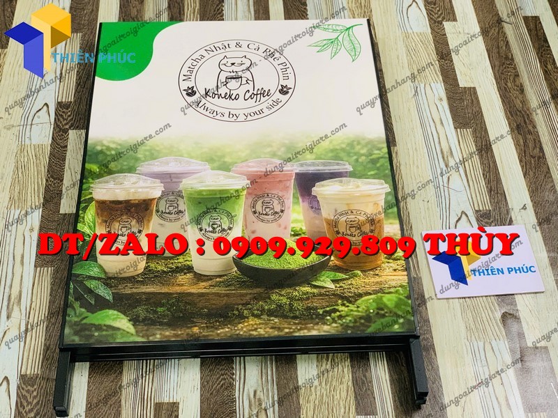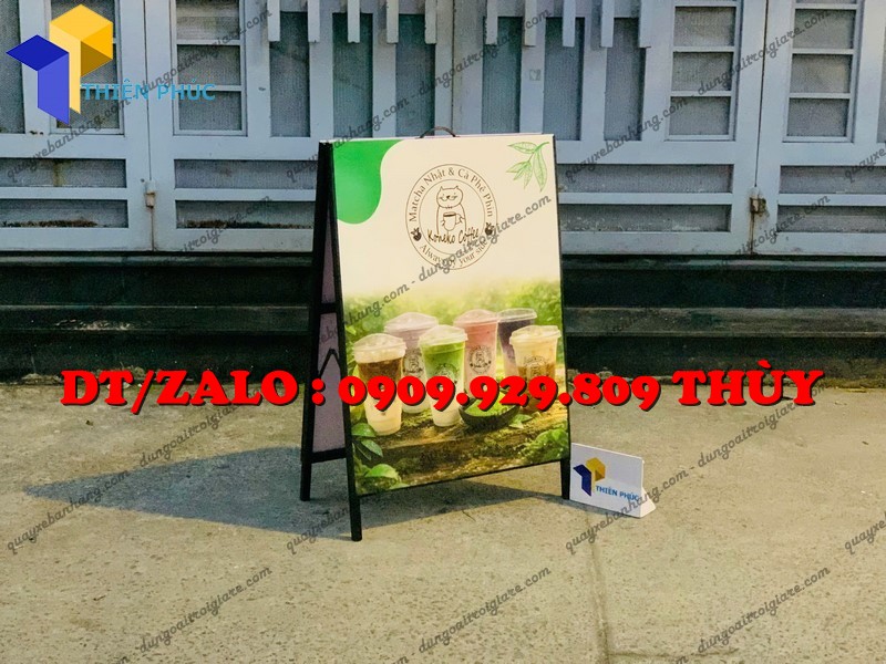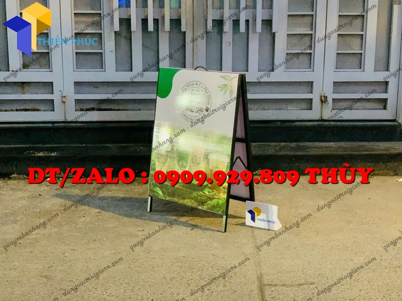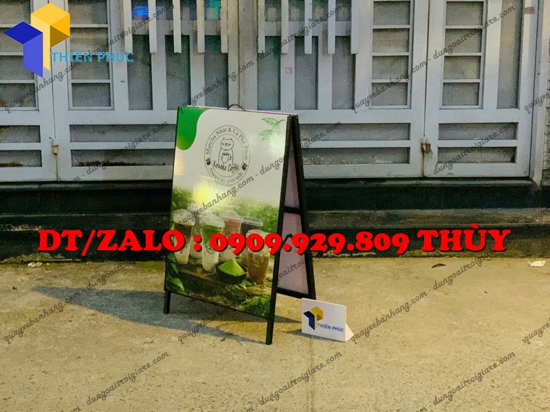Đây là loại standee khung chữ A, làm từ sắt sơn, có khả năng xếp gọn khi không sử dụng và trưng bày nội dung quảng cáo ở cả hai mặt.