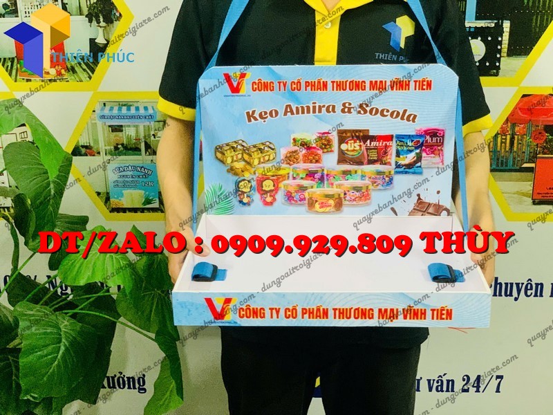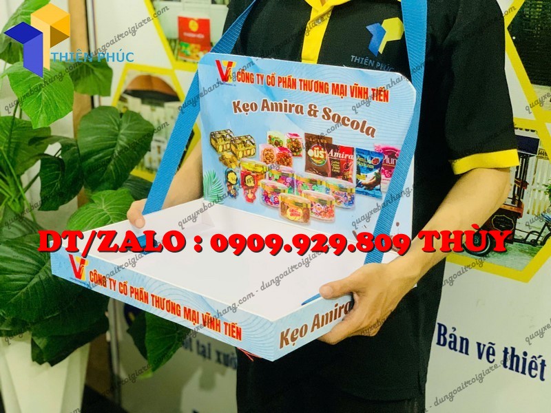 Khay được thiết kế vừa vặn thân người, trọng lượng nhẹ, có dây đeo vai chắc chắn giúp PG di chuyển thoải mái khi phát mẫu tại khu vực đông người như siêu thị, hội chợ hay event cuối năm.