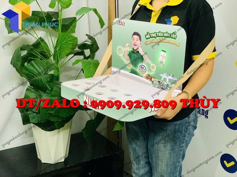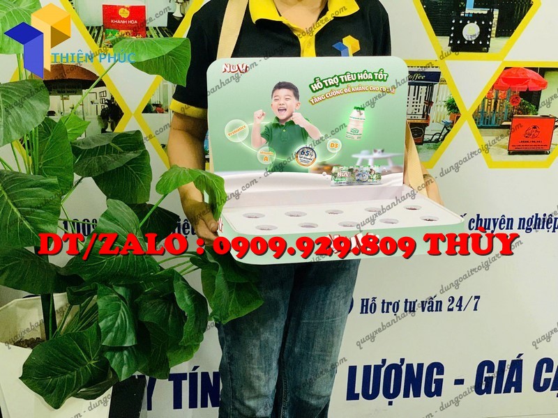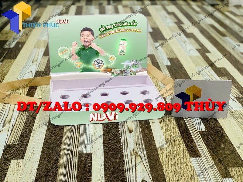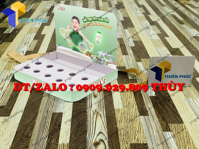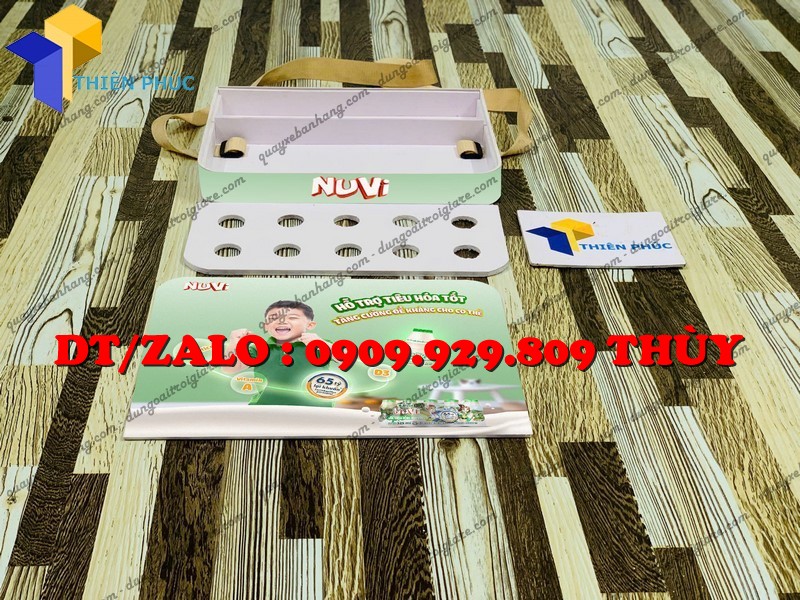 Khay có nhiều ô chứa tiện lợi: có thể đặt cốc giấy, chai nhỏ, tờ rơi, khăn giấy hoặc quà tặng mini. Giúp quá trình phát mẫu thử diễn ra gọn gàng và chuyên nghiệp hơn.