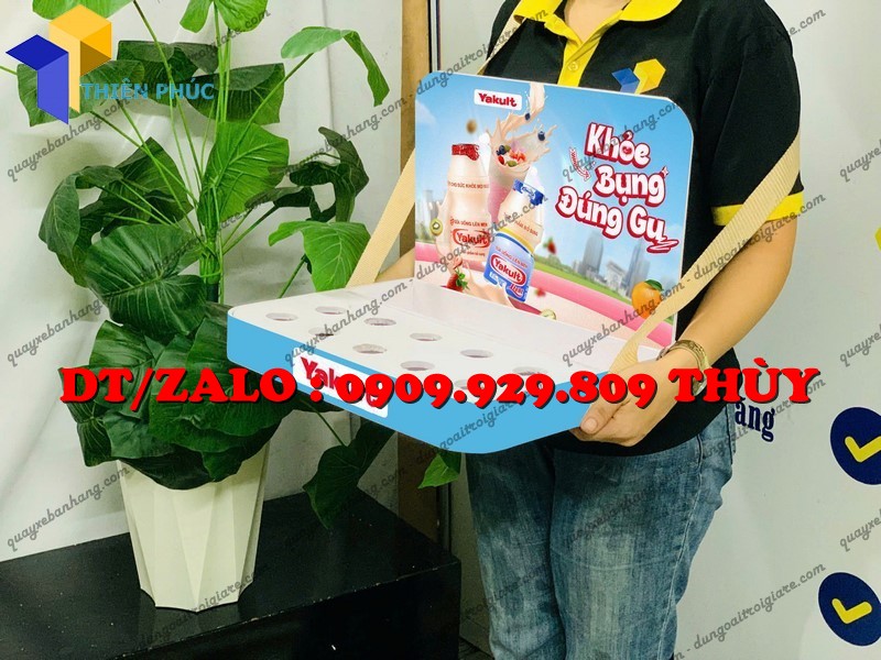 Khay sampling giới thiệu sản phẩm Yakult là khay nhựa fomat có dây đeo vai tiện lợi, dùng để trưng bày, phát mẫu sản phẩm sữa uống lên men Yakult trong các hoạt động quảng bá ngoài trời, hội chợ, trung tâm thương mại, trường học hay khu dân cư.