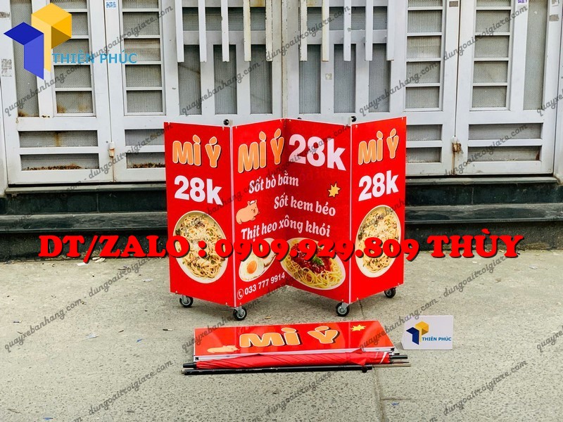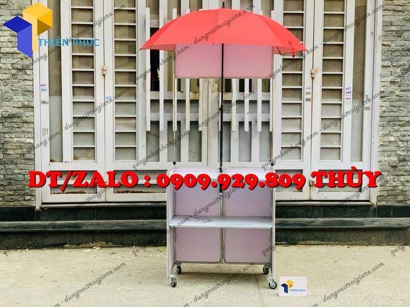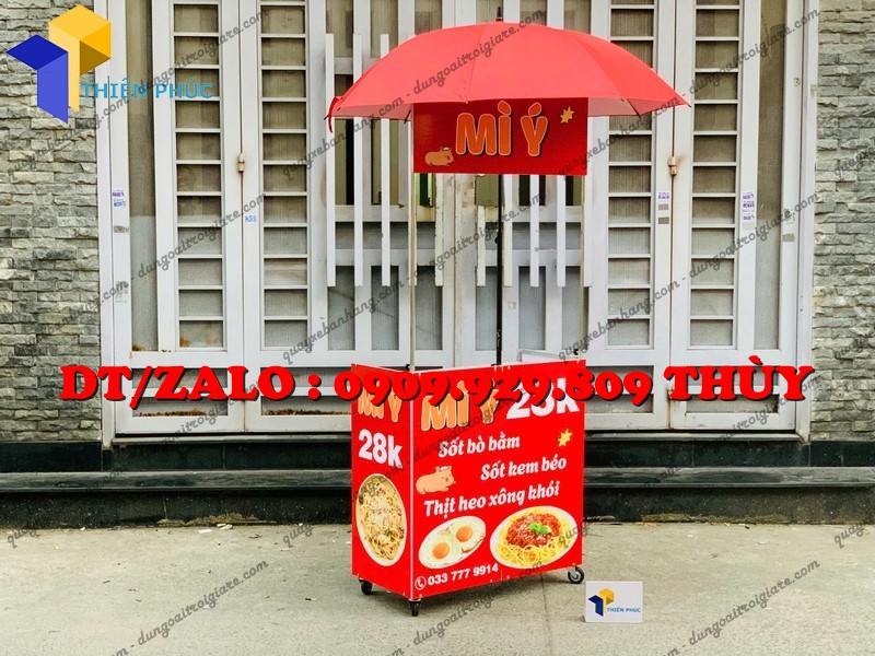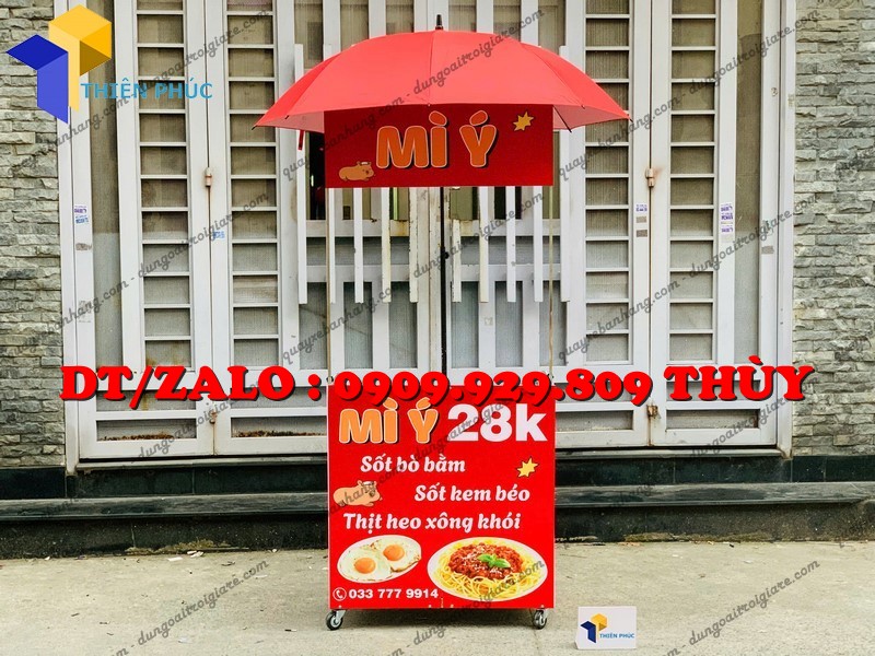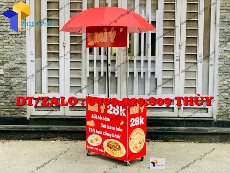 Đây là mẫu quầy bán hàng lưu động, thiết kế dạng lắp ráp gọn nhẹ, có dù che nắng mưa, phù hợp bán mì Ý vào buổi sáng tại vỉa hè, cổng trường, khu văn phòng.