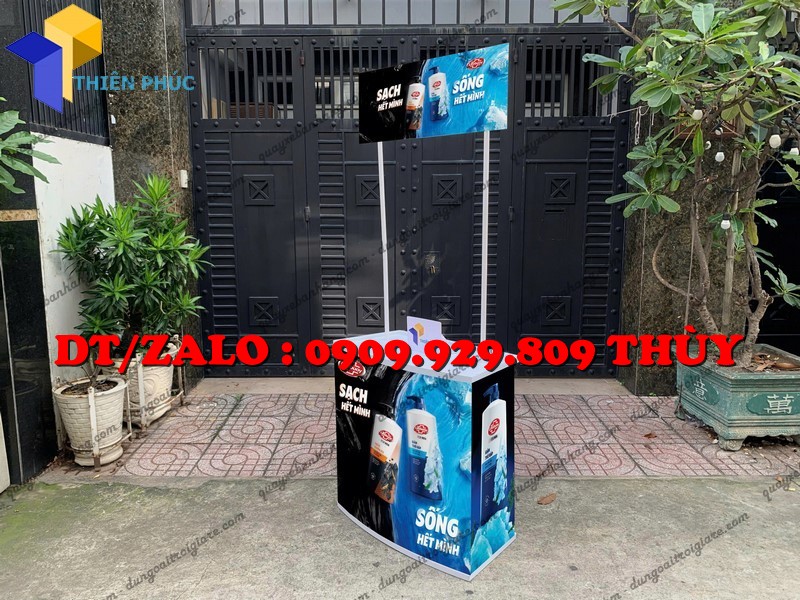 + Hai cây chống nối với logo và phần quầy bằng thép ống sơn trắng