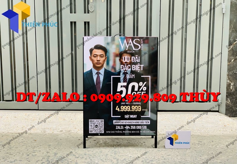 Standee chân xếp qunagr cáo giá rẻ Đây là loại bảng quảng cáo chân đứng có kết cấu khung chữ A, cho phép hiển thị nội dung ở cả hai mặt. Standee có thể xếp gọn khi không sử dụng, rất tiện cho việc di chuyển và bảo quản.