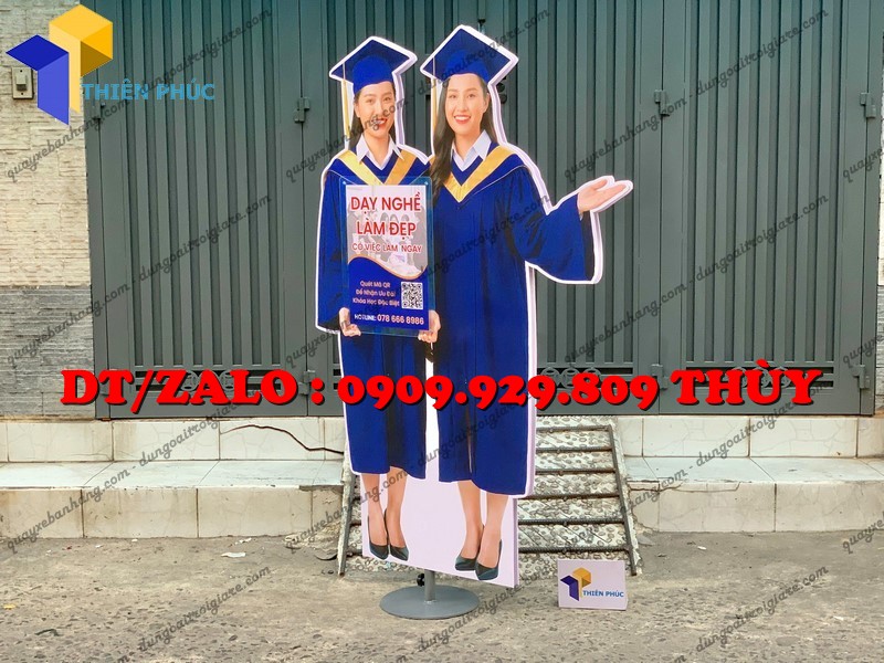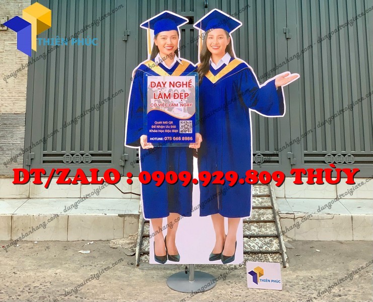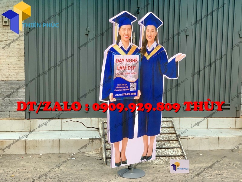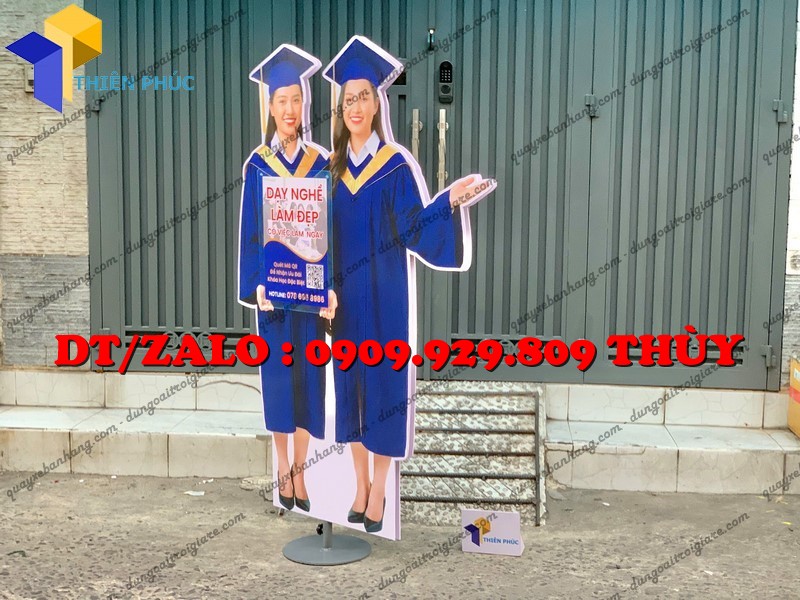 Đây là mẫu standee quảng cáo được cắt form theo hình người, thường mô phỏng sinh viên, học viên mặc lễ phục tốt nghiệp, cầm bằng hoặc đội mũ cử nhân.