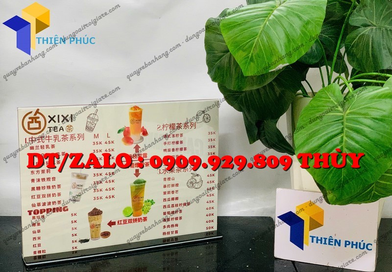 Bảng menu mica để bàn là công cụ không thể thiếu cho các quán nước, quán cafe, trà sữa, quán bánh ngọt. Với thiết kế gọn nhẹ, trong suốt và sang trọng, bảng menu giúp khách hàng nhìn rõ thực đơn, dễ dàng lựa chọn đồ uống hoặc món ăn, đồng thời tăng sự chuyên nghiệp và hình ảnh thương hiệu.