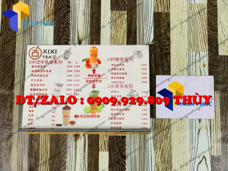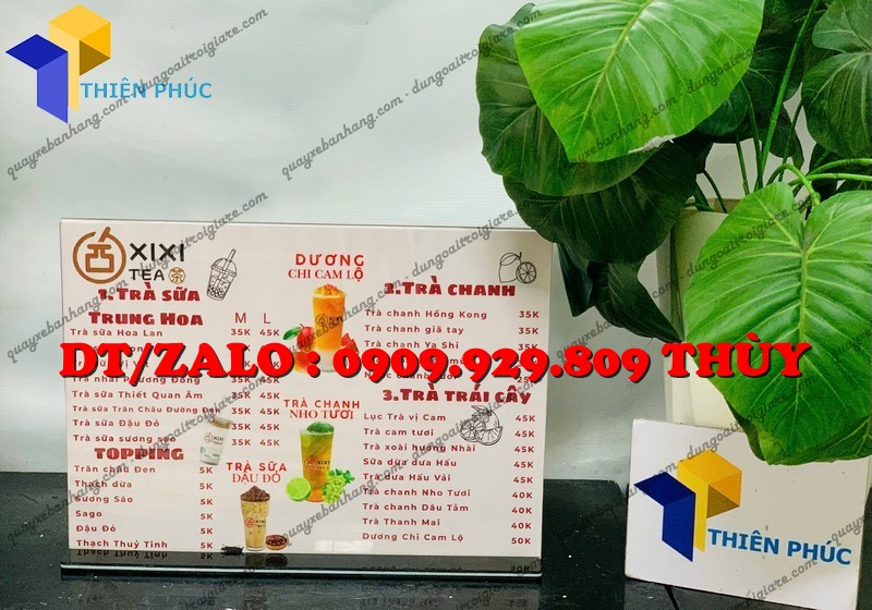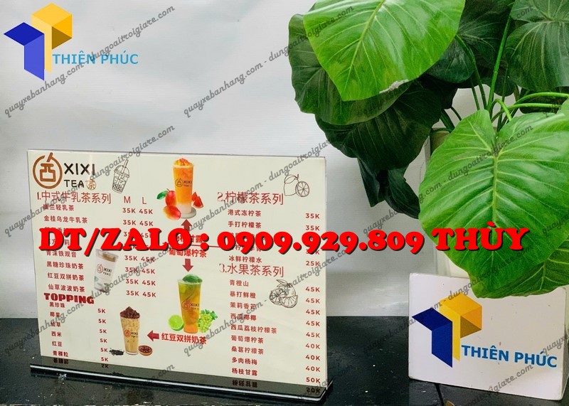 Bảng menu mica để bàn, sang trọng, tiện lợi cho quán cafe, quán nước, trà sữa – hiển thị menu chuyên nghiệp, in logo và dễ sử dụng.