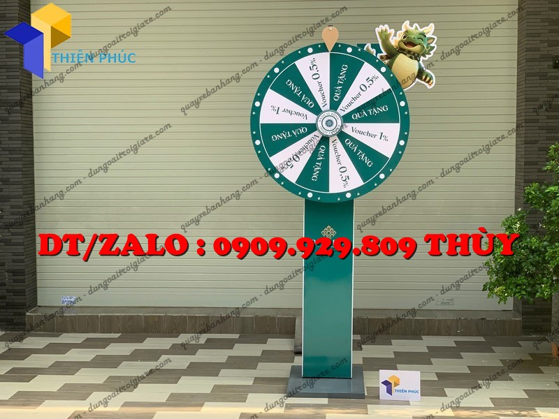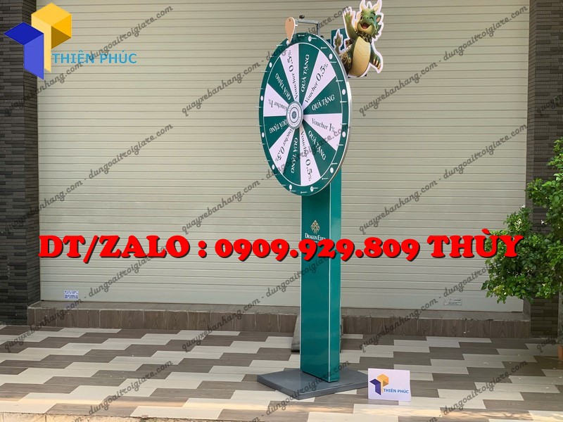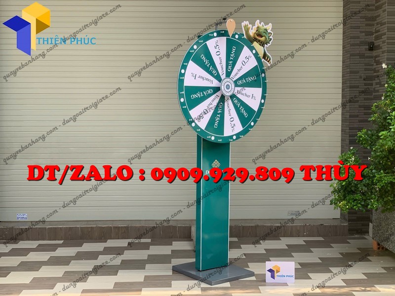 Đây là mẫu vòng quay trúng thưởng được thiết kế dạng bảng trụ đứng chắc chắn, phía trên hoặc xung quanh vòng quay có hashtag thương hiệu, hashtag chương trình, hashtag hình nhân vật được in nổi bật.