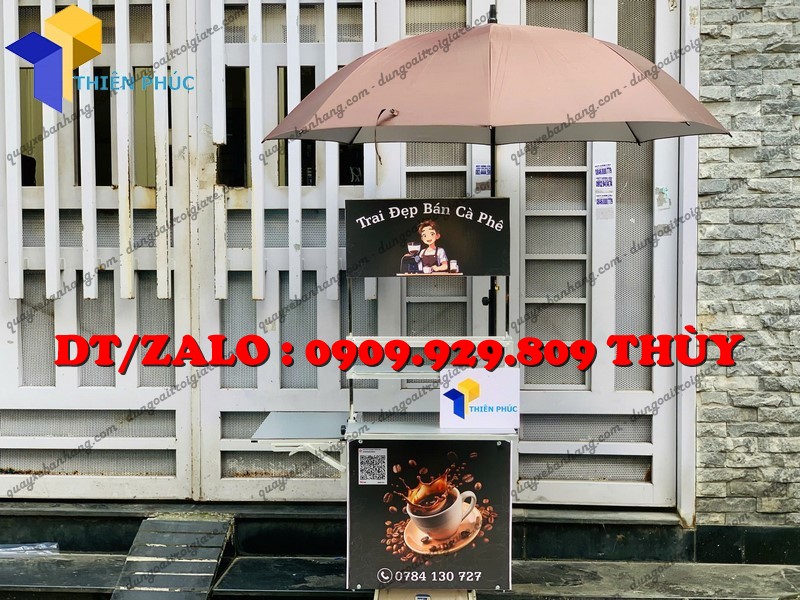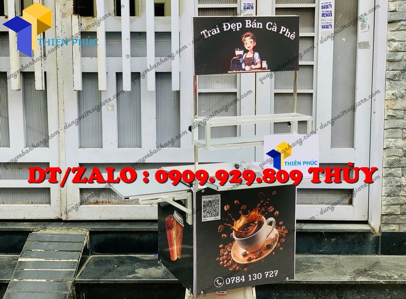 Thùng bán cà phê lưu động giá rẻ Đây là dạng thùng bán hàng nhỏ gọn, có thể gắn xe máy, xe đạp hoặc đặt cố định, tích hợp khu vực pha chế, để ly, nguyên liệu và dụng cụ bán cà phê mang đi.