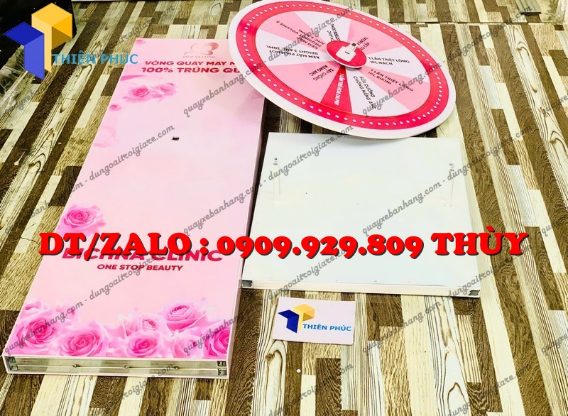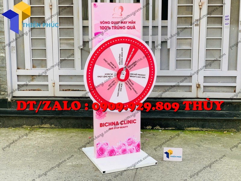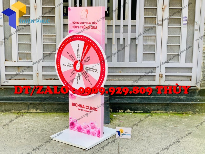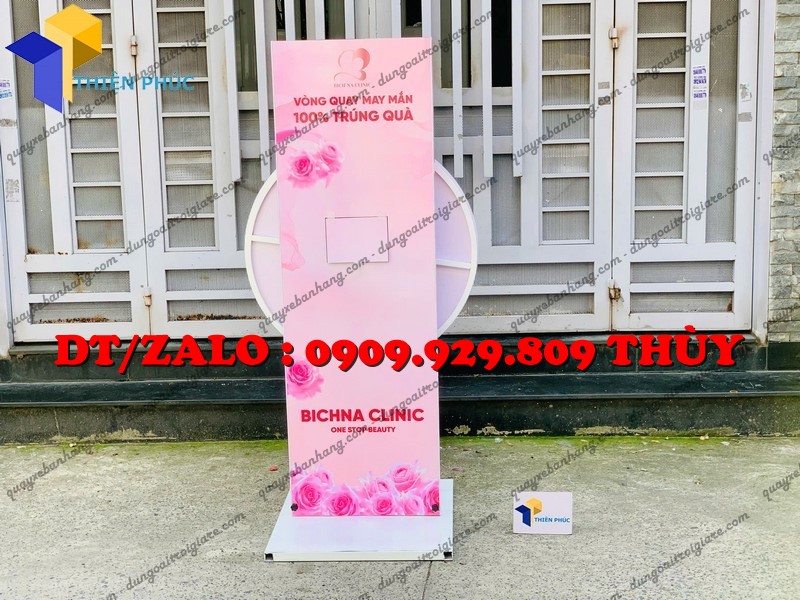 Với thiết kế thân trụ vững chắc, vòng quay có thể trưng bày dễ dàng tại spa, clinic, showroom hoặc booth sự kiện, phù hợp cho mini game, bốc thăm trúng thưởng, hoặc trò chơi trải nghiệm sản phẩm.