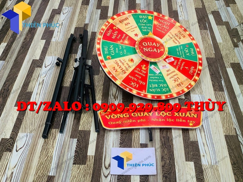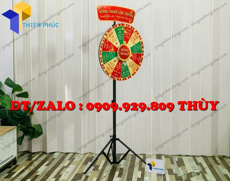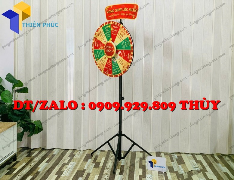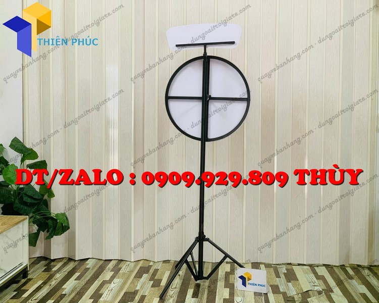 Đây là mẫu vòng quay random chân xếp giá rẻ được thiết kế với phần chân xếp gọn linh hoạt, có thể tháo lắp nhanh chóng. Bảng quay chia thành nhiều ô quà tặng khác nhau và vận hành theo cơ chế quay ngẫu nhiên (random), tạo sự hồi hộp và kịch tính cho người chơi.
