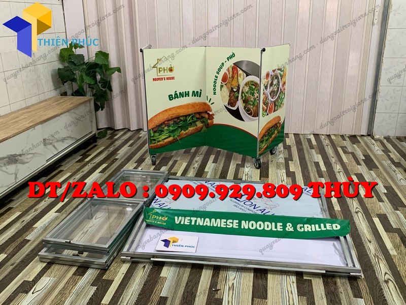 Xe bán thức ăn gắn tủ kính mica gấp gọn được thiết kế chuyên dụng cho các món ăn mang đi.