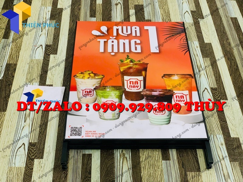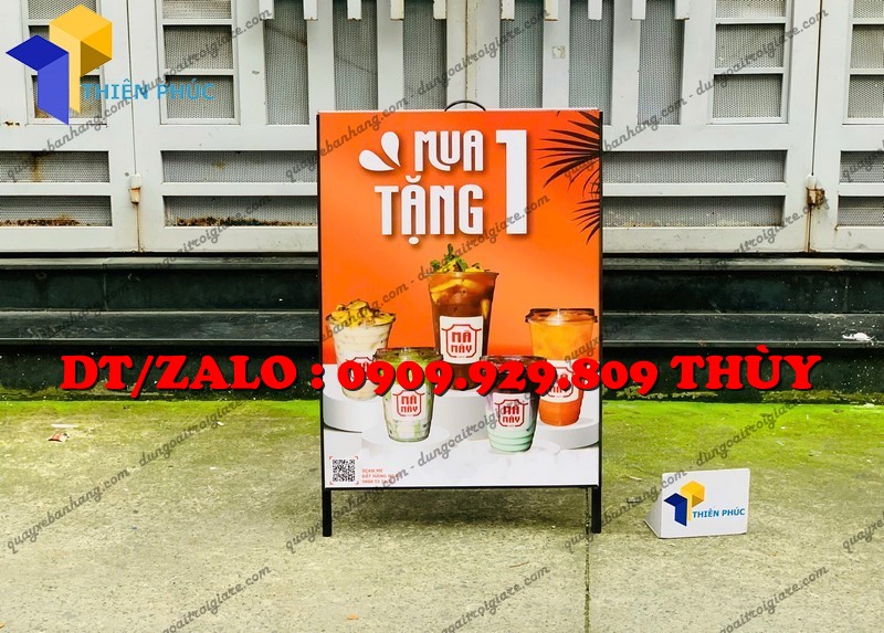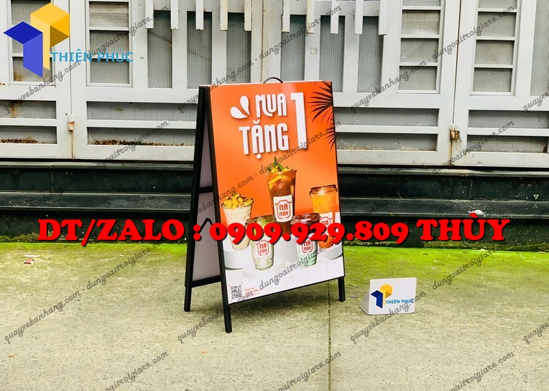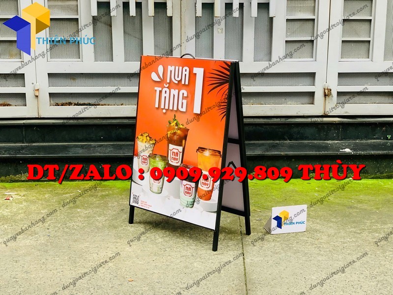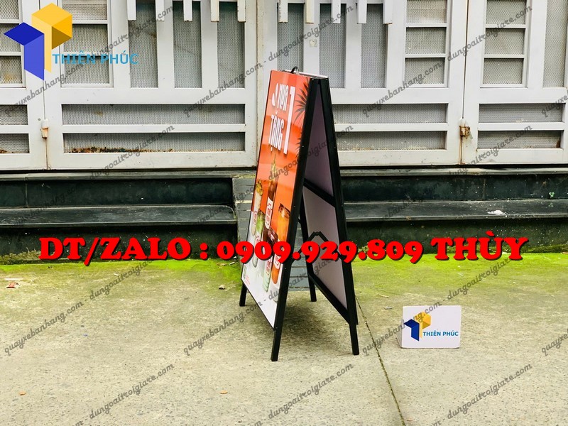 Standee chữ A gắn poster 2 mặt – hiển thị quảng cáo rõ nét, bền chắc, gấp gọn tiện lợi. Sản xuất trực tiếp tại Xưởng Thiên Phúc, giá rẻ, giao toàn quốc.
